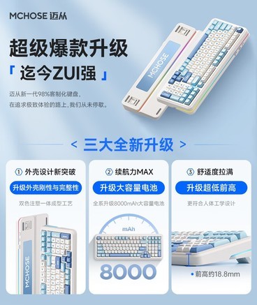 迈从 G98V2 机械键盘采用先进的gasket结构设计,带来更加纯粹的敲击体验,有效减少内部碰撞杂音,提升整体手感一致性。支持三模连接模式,包含2.4G无线、有线和蓝牙三种方式,适配多设备无缝切换,办公娱乐皆宜。全键热插拔设 [阅读全文]