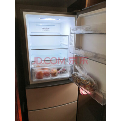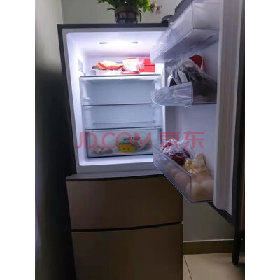 1.外观:金色的箱体,显得档次挺高的。2.空间:家用完全够用。3.运行情况:声音很小,几乎听不到运行时的声音。冰箱内部也没有异味。4.制冷效果:效果很好,智能面板还可以调节制冷强弱。