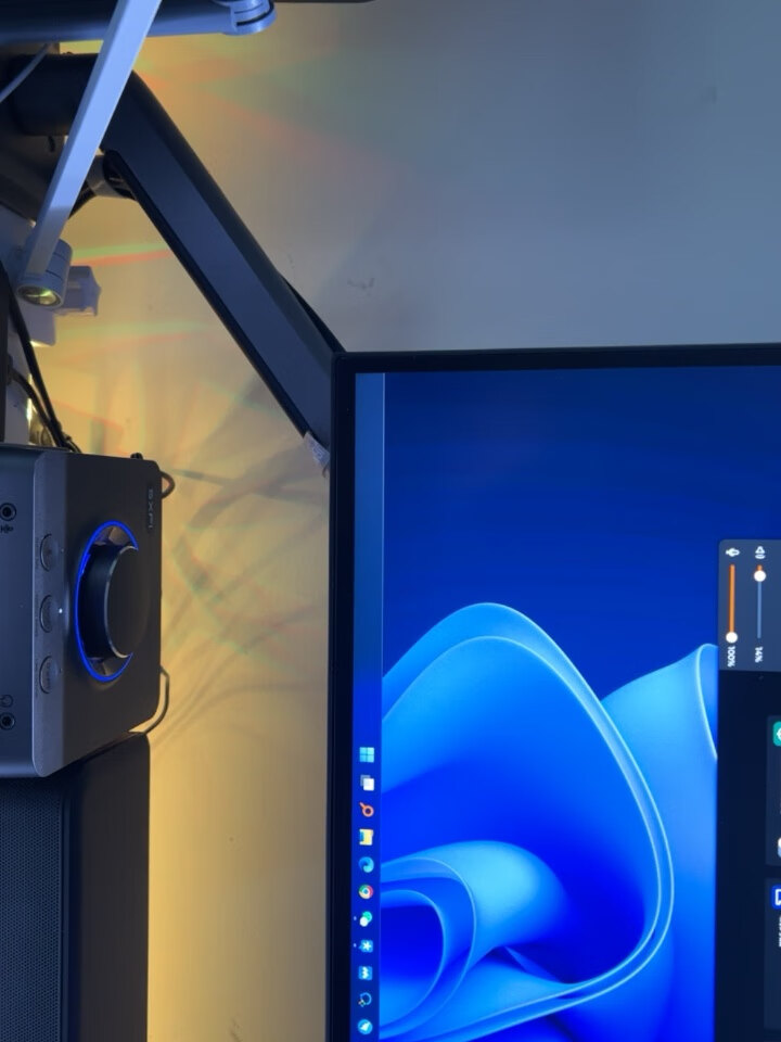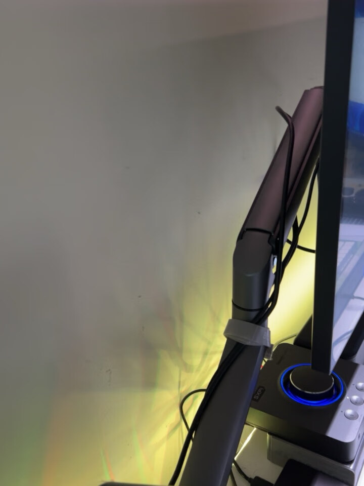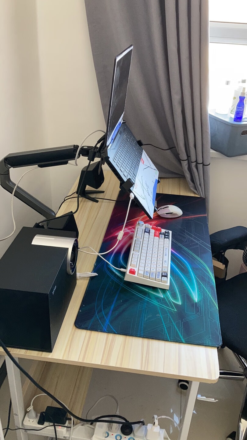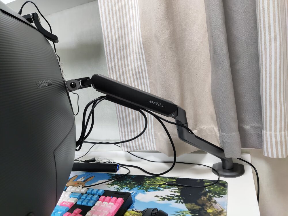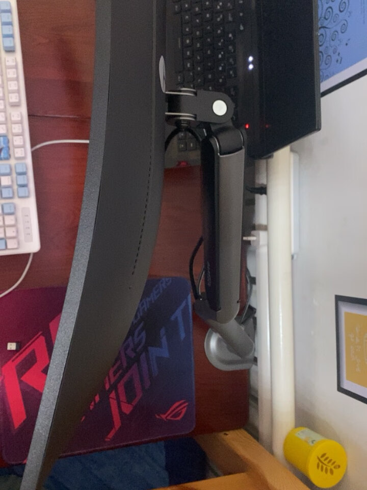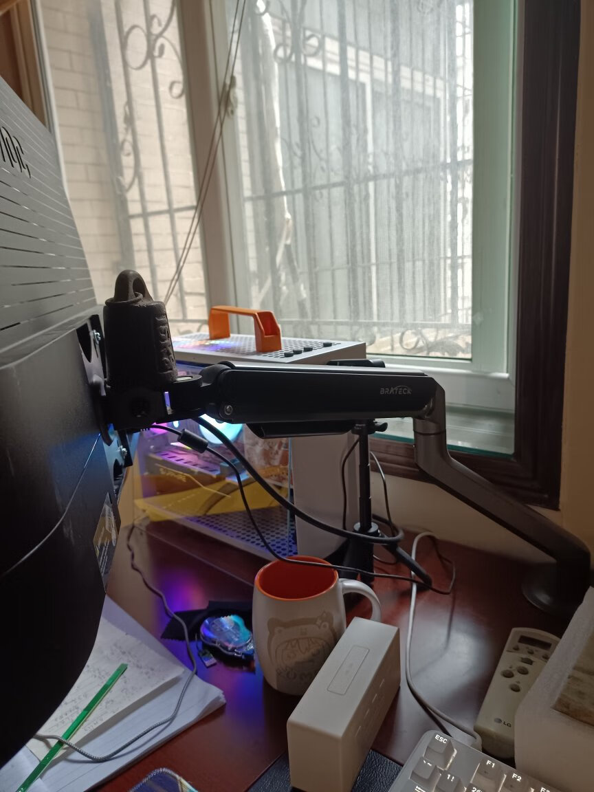 显示器自带的支架虽好,毕竟还是要占用一部分桌面空间,就不如用这种支架臂更自由,更省空间,可调范围更广泛,角度更多样,必要的话也能站起来办公,玩法很多。北弧的单臂和双臂显示器支架以及升降桌我都在用,做工和质量都不错,而这次用到的则是一款RGB支架,自带RGB灯光,更适合电竞房的氛围。