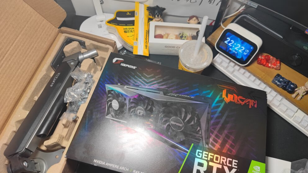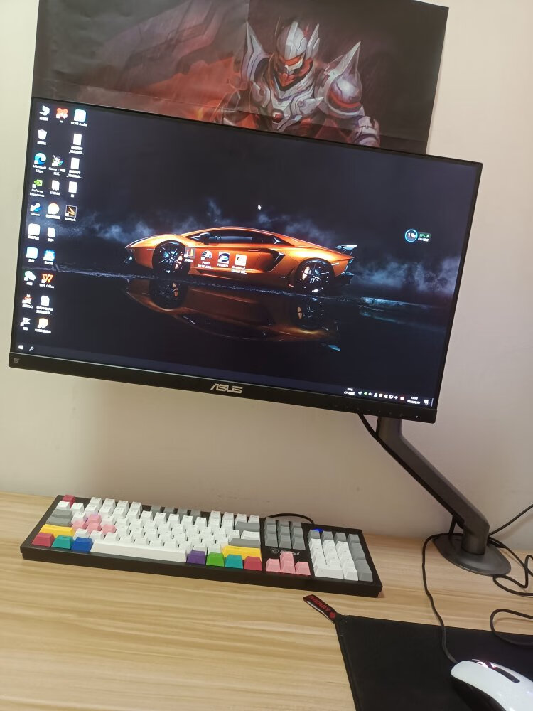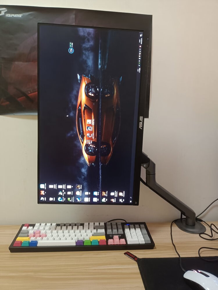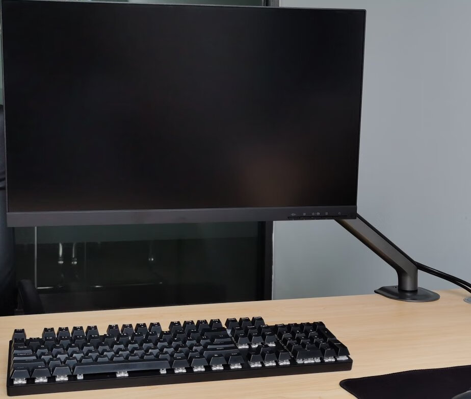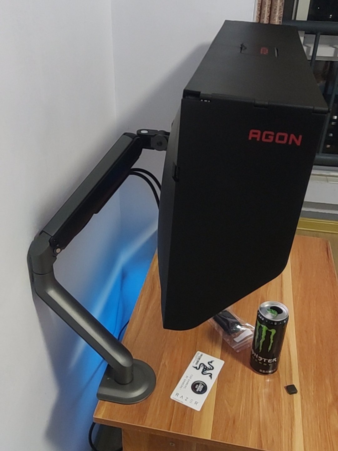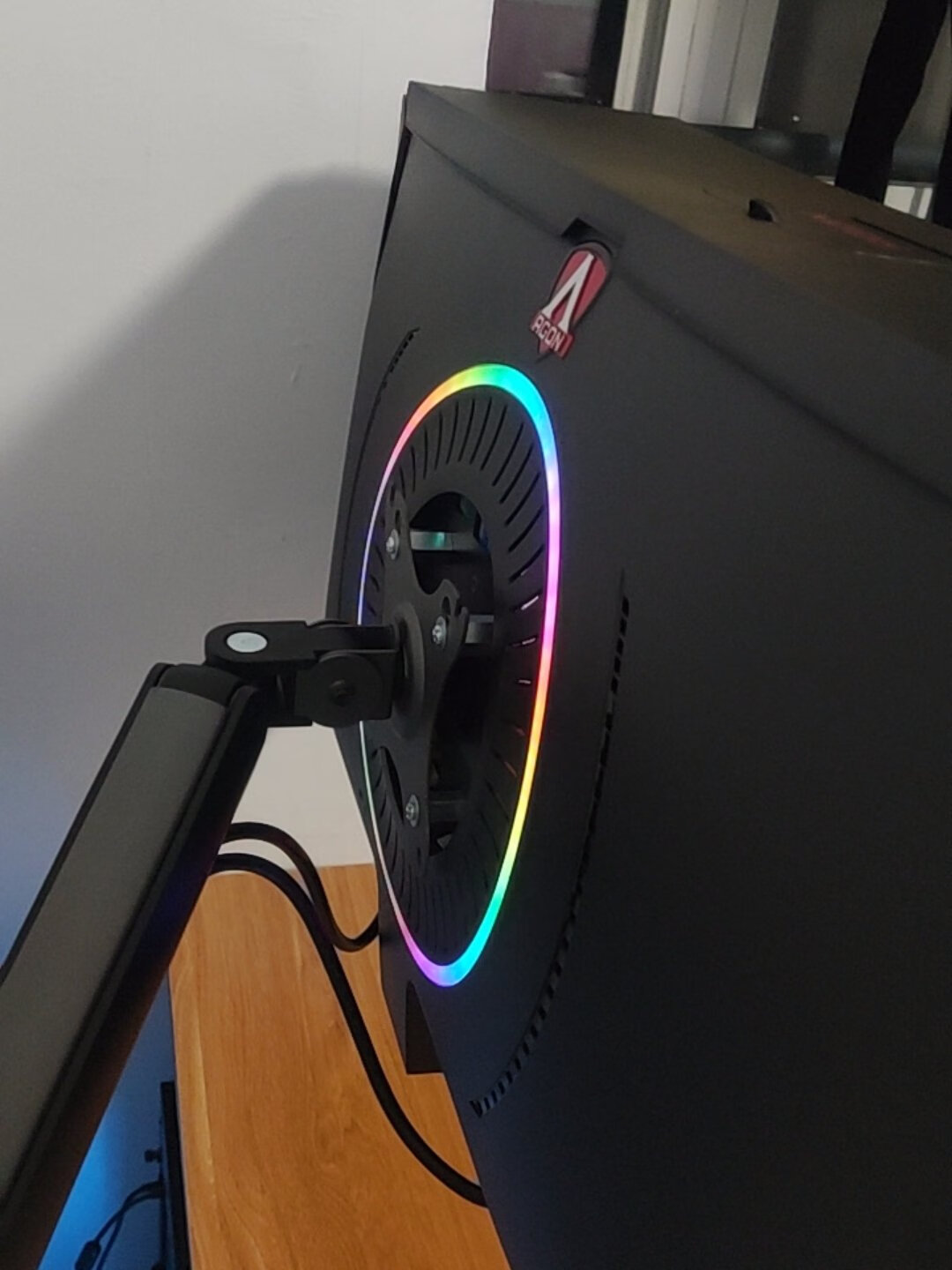 显示器自带的支架虽好,毕竟还是要占用一部分桌面空间,就不如用这种支架臂更自由,更省空间,可调范围更广泛,角度更多样,必要的话也能站起来办公,玩法很多。北弧的单臂和双臂显示器支架以及升降桌我都在用,做工和质量都不错,而这次用到的则是一款RGB支架,自带RGB灯光,更适合电竞房的氛围。