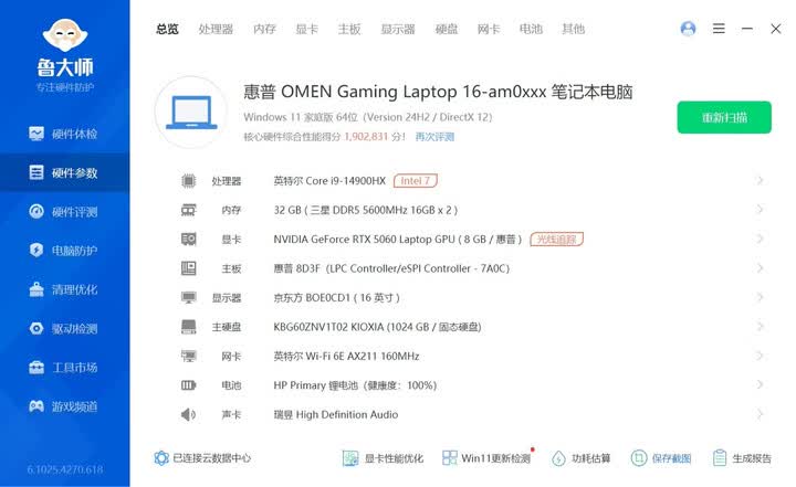 惠普(HP)暗影精灵11游戏笔记本电脑配置酷睿14代i7-14650HX处理器 RTX5070独立显卡 16G内存 1TBSSD固态硬盘 QHD240Hz高刷新率屏幕真的不错,机器启动速度很快,唯一遗憾没有人脸识别登录。
