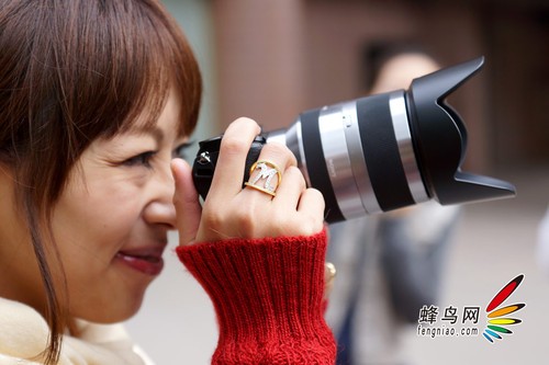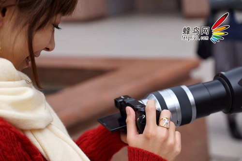 模特使用索尼微单NEX-7电子取景器