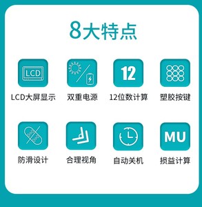 | 产品特点 | LCD大屏显示,自动关机,损益计算,塑胶按键 |