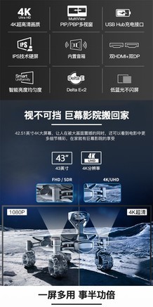 个人还是很喜欢的,43寸真的很大,家里以前那个电视都才46寸,这一下相当于买了个电视了。缩放是默认300%,直接成了超高清的720P。按钮基本都在背面,有点反人类,不过自带遥控的话倒也没什么大问题。而且还有画中画功能,对多屏用户很友好。60Hz对于我这种轻度FPS玩家足够了,难道144还能帮一个天生瞄不准的玩家自瞄? 性价比:2899整个这么大的家伙回来,要啥自行车。 屏幕尺寸:43寸,真的太大了嗷。跟自己以前那个328e1ca一比直接大了一大截,跟那个230s8q直接就是降维打击了。 外观设计:低调却不失奢华,很适合我的审美。 面板类型:IPS屏,据说比VA好不过我也没觉得VA多差呀。 显示效果:4k分辨率的同时支持10.7亿色,除了要DP接口以外还要显卡够牛才行。我的770接上去测试的时候是没法开10位色深的,等到时候拿3070试试看。