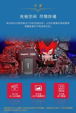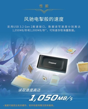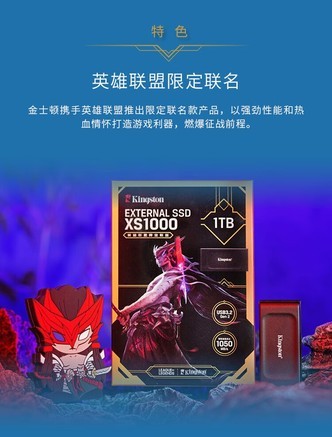 金士顿(Kingston)1TB USB3.2 Gen 2 移动固态硬盘(PSSD)英雄联盟 XS1000联名套装 永恩款 传输速度1050MB/s,硬盘非常炫酷,传输速度!