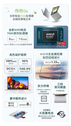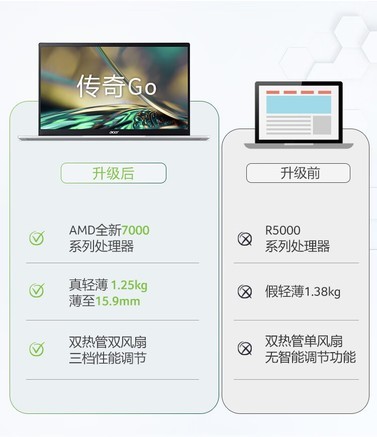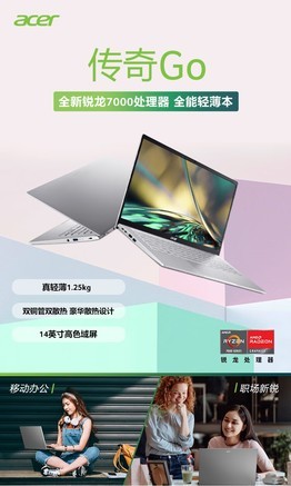 想要更多选择的话,可以考虑宏碁款,像去年的非凡系列,以及未来和传奇系列,性价比都挺高的。像这个传奇Go,搭载锐龙R5-7530U处理器,有4.5GHz频率。屏幕是14英寸高色域,有1080P分辨率,配置是不差。而且散热是双铜管双风扇,散热能力也挺好。它和之前两款相比,我觉得特点是只有1.25kg,这也是宏碁轻薄本的特点。当然,同样预装了办公软件,挺适合想要轻一些的女生用。