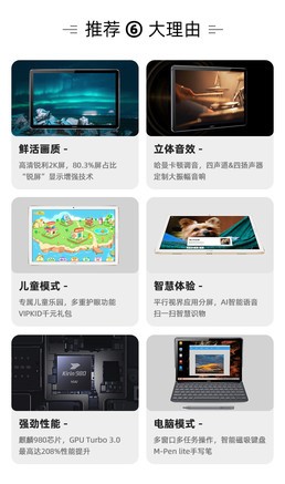 1、音乐效果超级棒,养耳朵; 2、视频显示也很好,养眼; 3、麒麟980处理器强大,不亚于英特尔i5台式机CPU,对于一般办公娱乐绰绰有余; 4、可以选配触控笔和底座,生产力工具妥妥的; 5、尺寸适中,厚薄、重量都还觉得可以。是自己的手机和笔记本的中间形态,带上底座和外套,外出携带很方便。